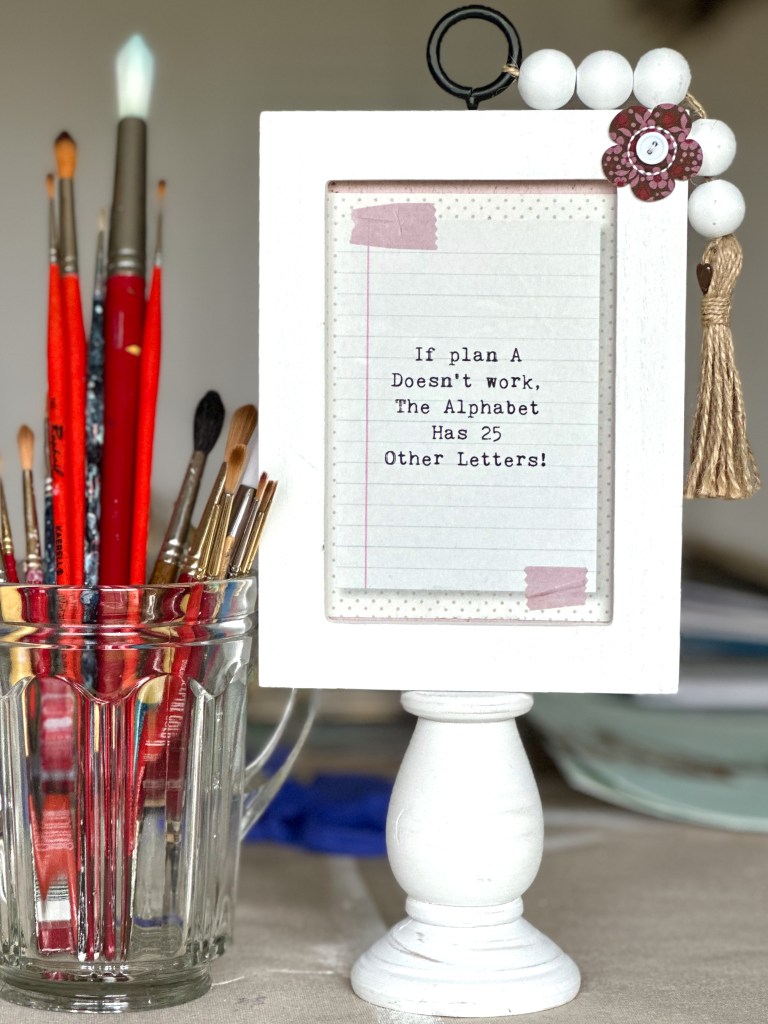 Years ago, when scrapbooking was my creative outlet, once or twice a year I would spend the weekend with a small group of friends in a craft store north of Pittsburgh. One of those women was an unrelenting perfectionist. If she could not find the perfect shade of seafoam green paper or decide which photos to include on a layout or, heaven forbid, made a mistake in cutting or gluing, she would abruptly stop and put the entire unfinished page away. She described having stacks (well over 50 at that time!) of unfinished pages she’d started but never completed because of some creative roadblock encountered on her path to perfection. The moment she got stuck, the page immediately went onto her purgatory pile, waiting in limbo … for the perfect piece of patterned paper or the perfect embellishment because, if it couldn’t be perfect, couldn’t be exactly how she had envisioned it at the start, then it couldn’t be finished, and couldn’t be put in her album. At some point, over the years of observing her repeatedly paralyzed by her need for perfection, I came upon a tear-out card in a Flow magazine that said, “If plan A doesn’t work, the alphabet has 25 other letters!” I placed it in the middle of my work table at home and adopted it as a mantra. Years later it’s now in a cute little frame, still prominently displayed in my line of sight as a gentle yet powerful reminder (image below.) For I, alas, can also be a perfectionist. Yet, as I watched my friend falter in the creative process time and time again, I saw what a potent poison perfectionism can be, and I vowed to not be another one of its victims. I had so many photos and so many stories to tell from our family’s life, I didn’t have the time nor energy to make them all perfect. When I hit a roadblock or made a mistake (frequently), I found a work-around, a plan B (or a plan Q!). I chose to see my inevitable blunders as creative opportunities and kept moving forward to finished pages, stories told, memories captured, and albums filled. None of them are perfect, but all of them are good enough. For I always understood the sum was greater than the parts; an album full of completed pages we could enjoy looking at together as a family was far more important than any single “perfect” page (and a mammoth pile of unfinished ones no one will ever see because they’re stuffed in a plastic bag on a folding table in the corner of a spare room.)