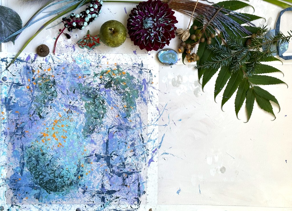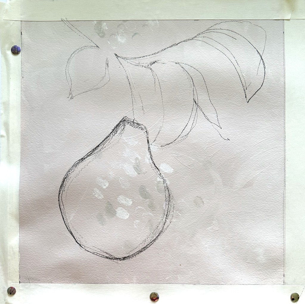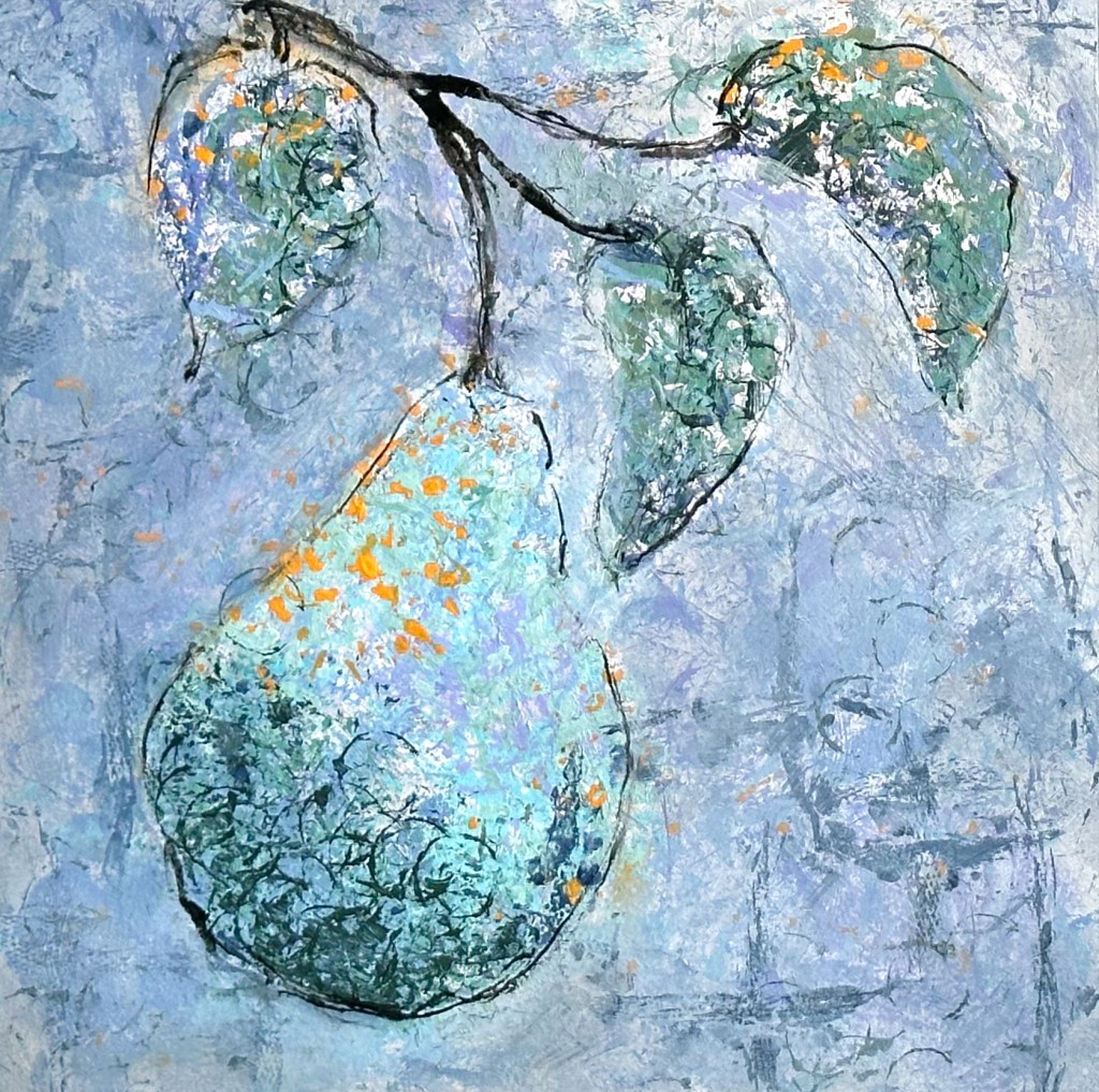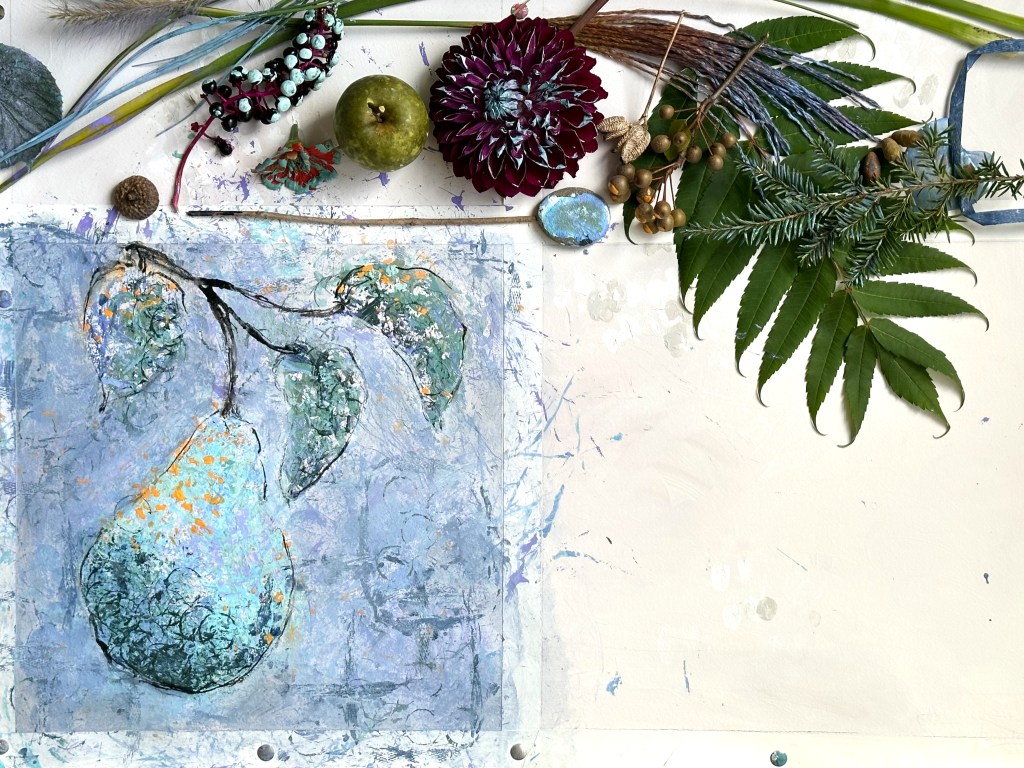 As I close the door on 2023, I’m feeling compelled to choose a new word (or 2!) for 2024, to set new intentions and to see where they might take me in the year ahead. “GENEROUS” is a concept I hope to embody in my daily life and decisions. When faced with choices in the New Year, I’d like to pause and consider, what would being generous look like, sound like, act like in this situation? “PLAY” is the other word I’m hoping to explore. Yes, at age 59 I’d like to incorporate more spontaneity, fun, laughter and play into my life. Perhaps it’s my way of circling back to the 1st One Little Word I chose in 2011, “JOY?” In an online art workshop I just finished called, “Find Your Joy” with artist Louise Fletcher, I was encouraged every week to play with paint, to let go of the need to achieve a result and to simply find joy in the process of making art. For 1 of the assignments, I “painted” the pear featured in this post using only objects I found in nature on my walks with my dog (the photos below show the objects I used and some steps in the process, from reference photo to finished work). Who knew I could make an entire painting without a paintbrush, what fun! I’ve titled the piece “Play” and will hang it in my studio in hopes that it will inspire me to invite more play into my art and life in 2024. What do you want to invite more of into your life? Choose a word, just One Little Word. Then set some intentions and see where they lead you in the year ahead!
