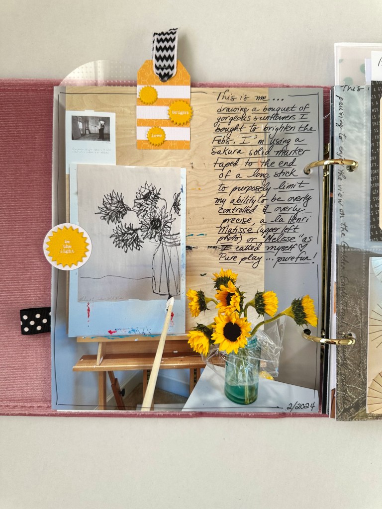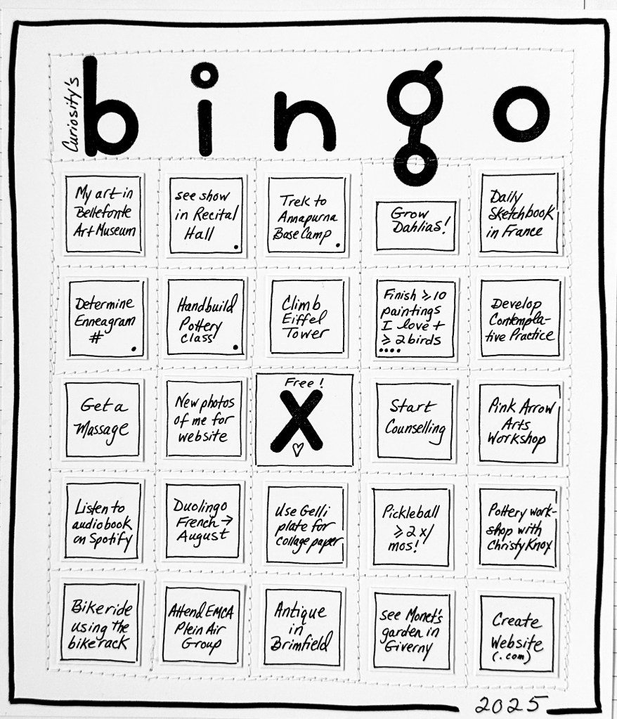 It’s been a lovely winter for me, spent happily making art from my life. I crafted a PLAY-book, a small scrapbook filled with words and photos from my 2024 One Little Word, “PLAY.” I created a digital photo book from our trip last winter to Patagonia in southern Chile and Argentina. I went on an Artist’s Date to Barnes & Noble where I purchased 3 beautiful magazines (guilty pleasure!) and then spent a few glorious days designing a vision board of images and text cut from their pages. I’m hoping it inspires me to live into my 2025 word, “CURIOUS.” I also fashioned a Bingo card, a fun, creative way to document and track some intentions for this year. Oh, and I painted, a lot!