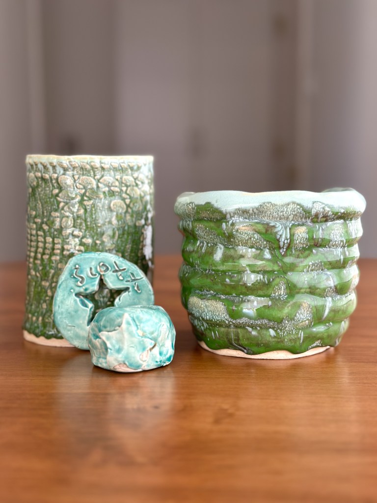 3 pottery pieces from my recent class and an old treasure I’ve saved from Scott’s elementary school days (circa 2005)