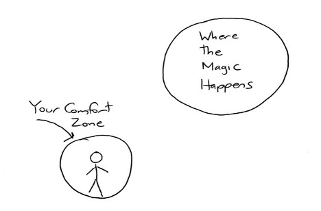 As I age, I find myself increasingly succumbing to the gravitational pull of my perceived comfort zone where, following Newton’s First Law of Motion, my body stays at rest until acted upon by some outside force (my husband, in the case of this trip). I all too easily get stuck in my patterns and my routines, my inertia. However, looking back over the arc of my life, one thing I see for certain, is the most magical moments I’ve experienced have all occurred outside the confines of my cozy comfort zone (see figure below). At 60, I’m not yet willing to sacrifice the magic for the perception of “safety.” Having written myself again, in the airport, to this realization, I put down my pen and “took my old body” onboard the plane to fly through the night. I promised myself I would go “out into the (next) morning” with curiosity rather than fear.