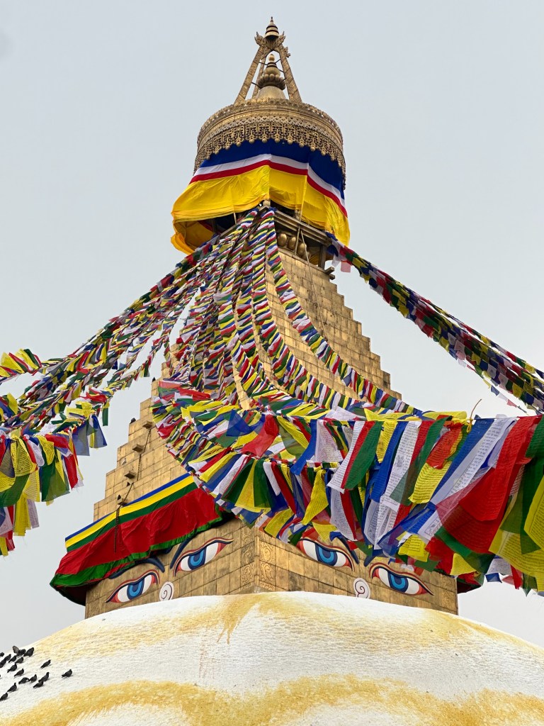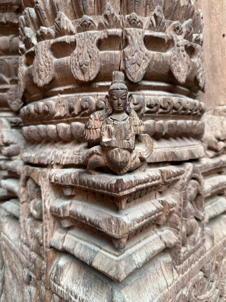 Below: Prayer flags over Boudhnath Stupa and one example of incredible ornately carved wood