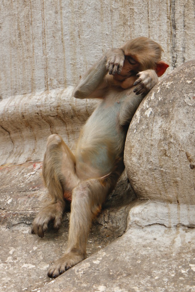 Below: Monkey at Swayambanuth (The Monkey Temple) in Kathmandu. This is how I felt in the airport, strung out on my worries before our trip to Nepal.