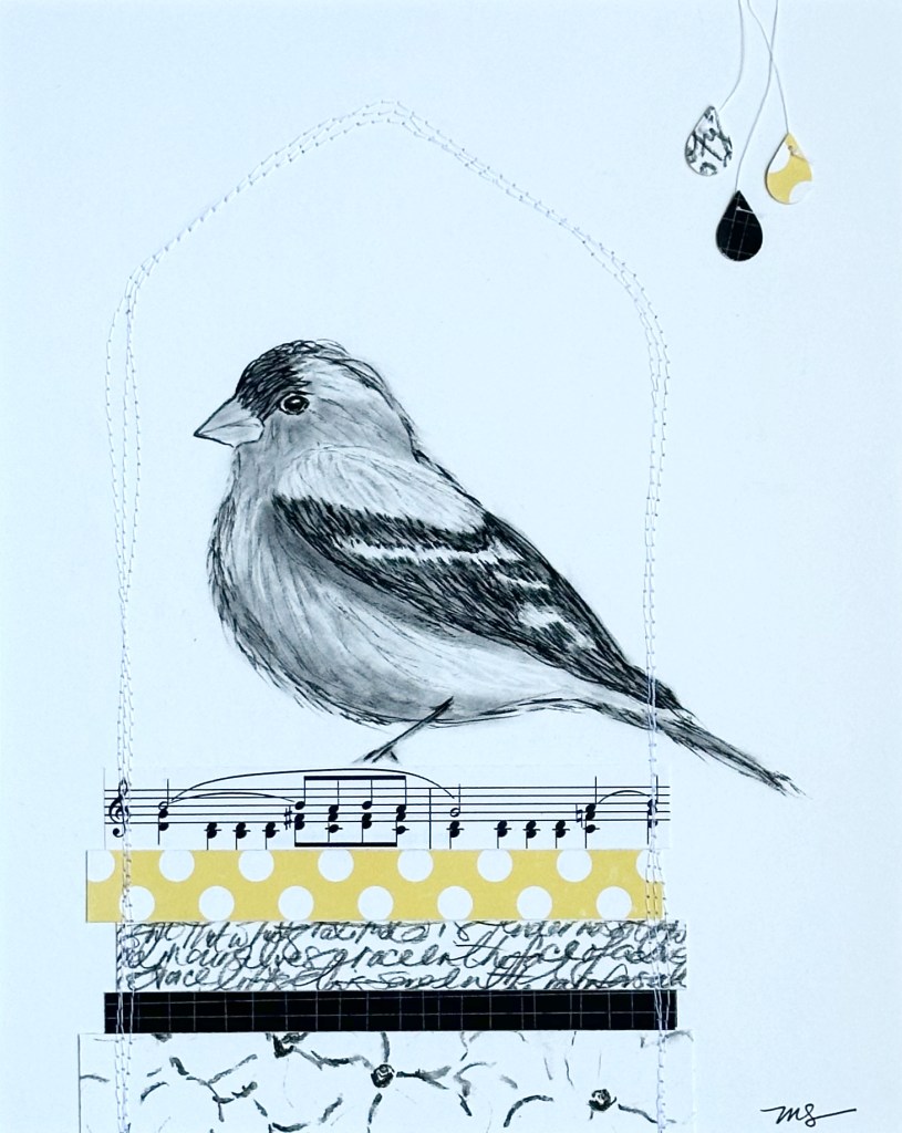 It took me months to create my piece of art (featured above) in response to Rebecca’s lovely poem. Many ideas and many attempts frustratingly hit the recycling bin. Finally, I found my way, not surprisingly, by returning to some of the tools and materials I enjoy most: a charcoal pencil (the goldfinch); scraps of collage paper (the bird’s feeder); and stitching with my sewing machine (the church window-like frame). My bird, like the one in the poem, is lifting her voice, singing her “paean to the rain” (the drops falling from the upper right corner).
