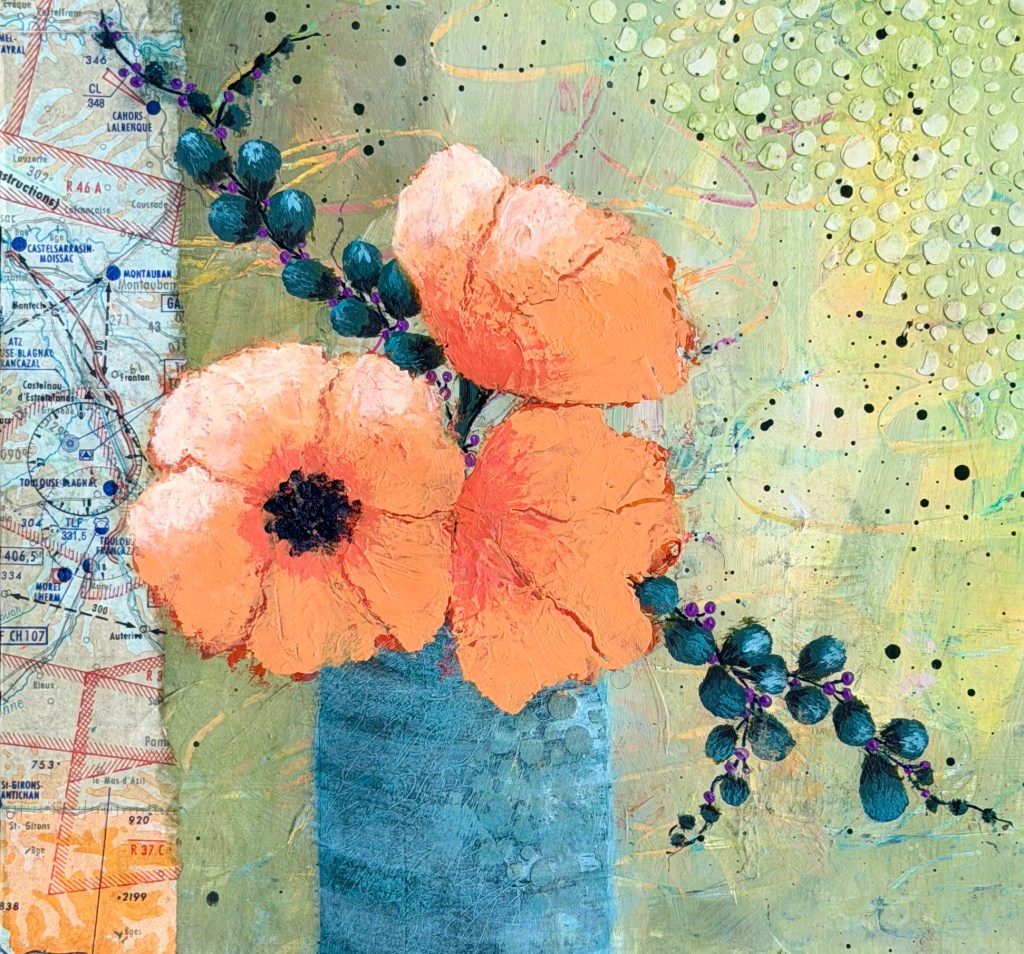 January 2026’s post (“Be Where Your Feet Are”) refers to this painting. The map, adhered to the lefthand edge, was purchased from the Paris flea market. I believe this is my favorite painting of this group of 9: I love the colors; I loved the process (far more important, always, than the result); and, most importantly, I love the risks I took along the way (painting and repainting the orange flowers, sanding and repainting the vase, and adding the details onto the branches). A lot went into these 64 square inches!