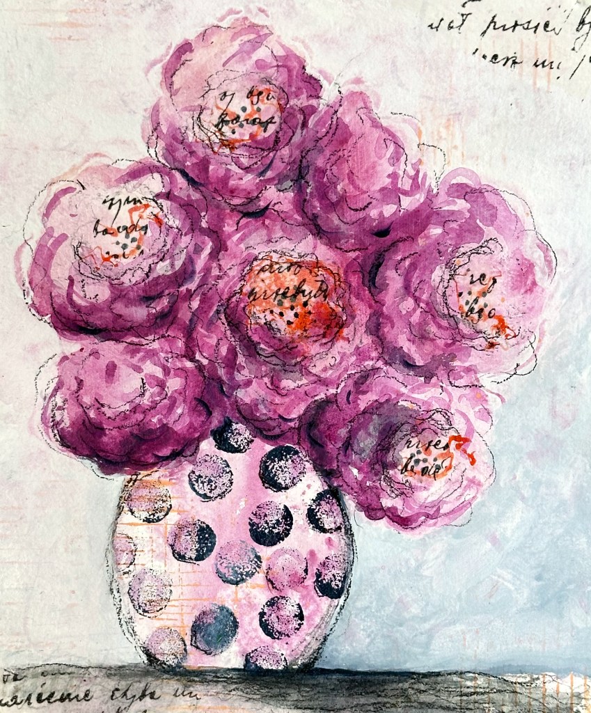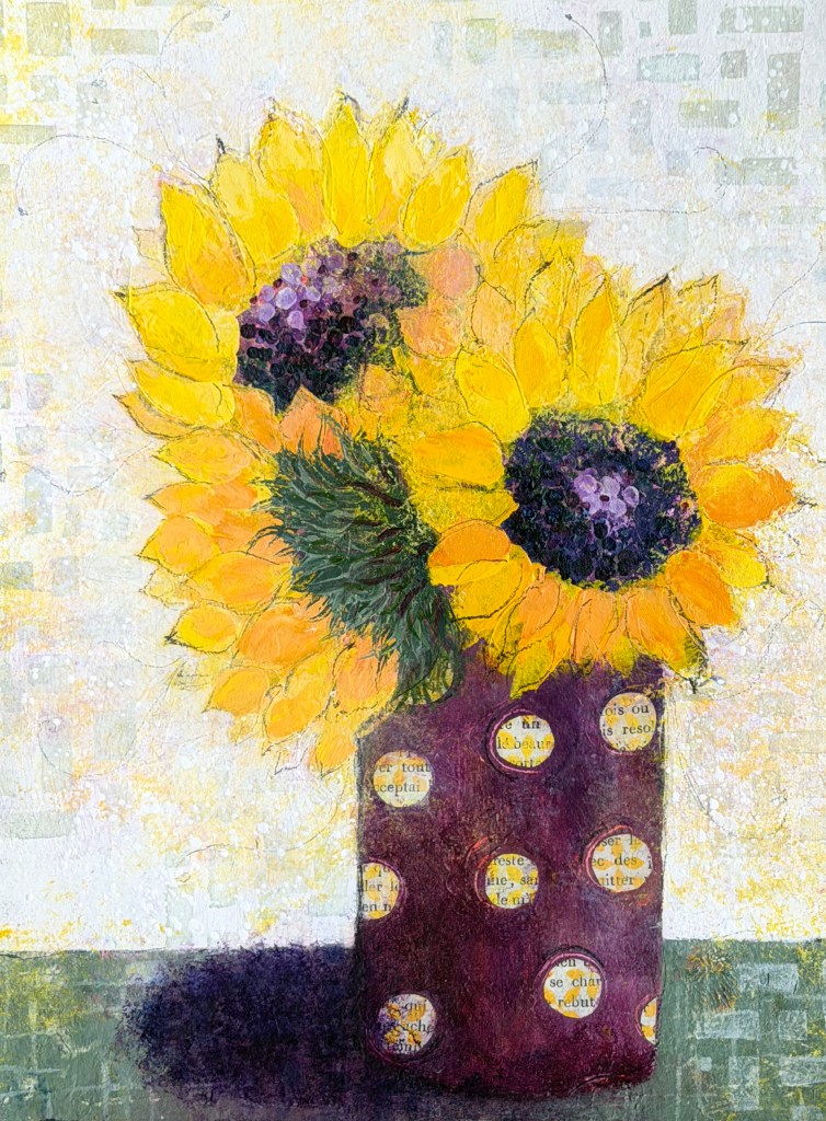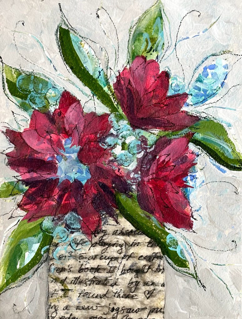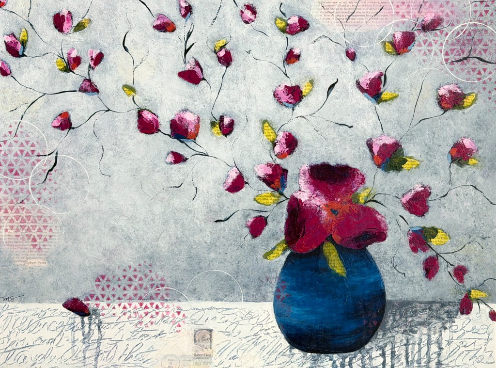 For close to 30 years, I’ve kept a gratitude journal. The practice of writing 5 things at the end of each day for which I am thankful has been life changing, especially when our 3 children were small. Recently, I decided to tear apart a few of those old journals to use as collage paper for my art. One of those pages serves as the vase in this piece. I love the way the glue (Golden’s Matte Medium) slightly blurs the ink of my handwriting. Yet I can still read, on that day, I was thankful for: our dog, playing, a cup of coffee, a children’s book, and a new jigsaw puzzle. In the simplicity of those ordinary, celebrated moments, all these years later, I still recognize myself. For that I am grateful.