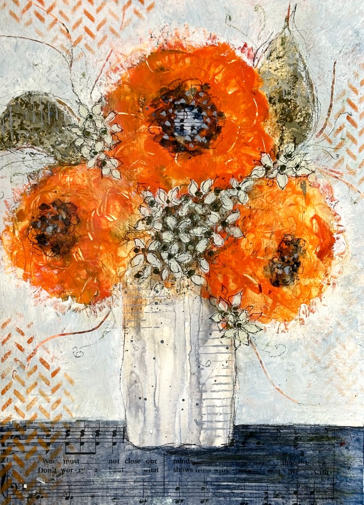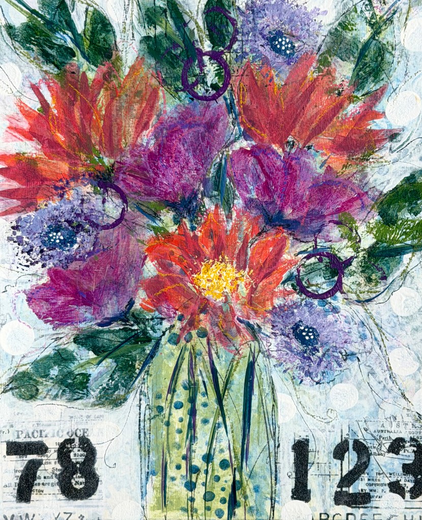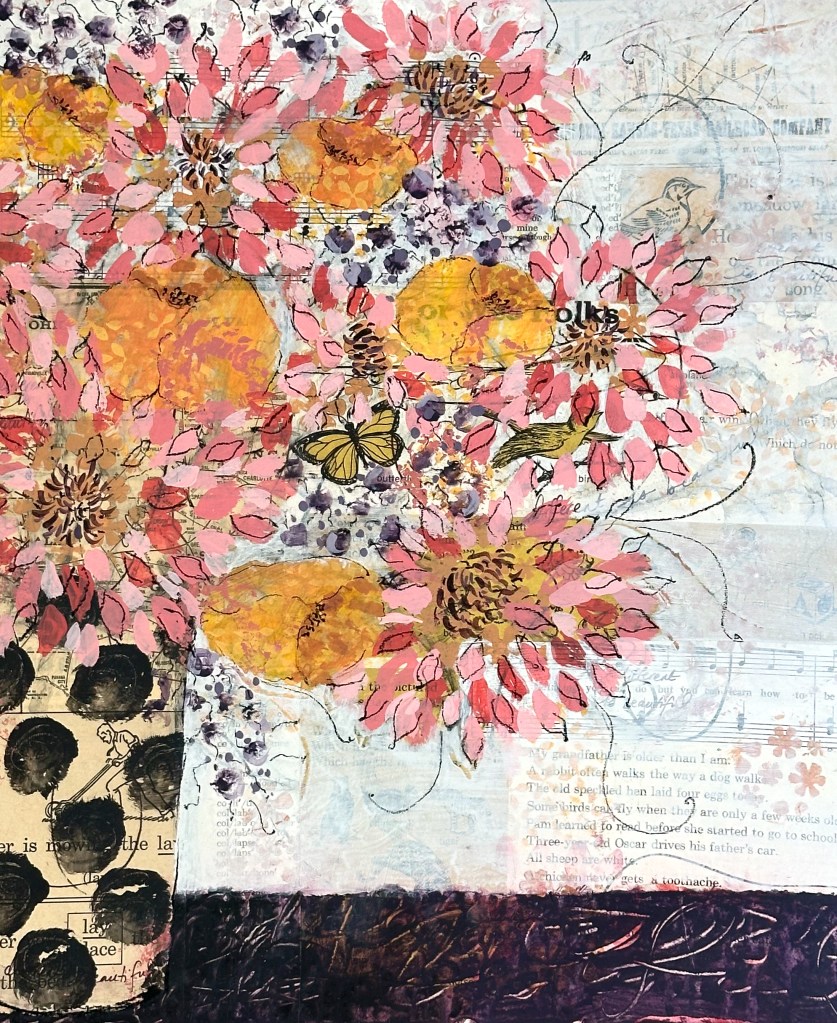 The other common denominator among all 9 pieces is my use of collage paper within the work: maps, old journals, music, children’s books, printed tissue paper, old sewing patterns, etc. In every painting, within the blooms, leaves, vases, tabletops, or backgrounds, collage paper appears, adding words or notes, numbers or images to the florals. This is the visual interest I adore! For me there is no greater compliment than when someone lingers, looks closely at my work, and exclaims, “Oh, look at that!”