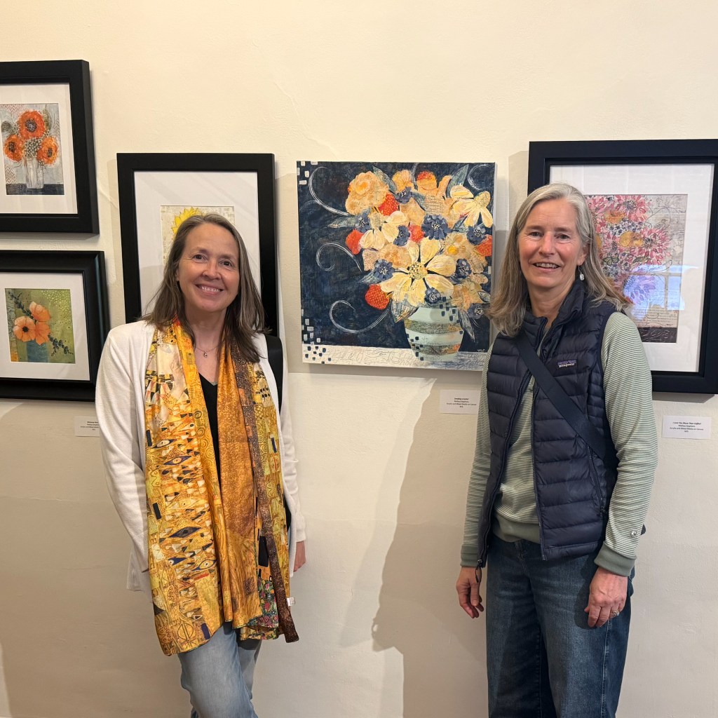 As winter continues to hold us captive in its chilly grasp, I welcome you to “The Flower Shop,” where florals delight your senses despite the frigid temperatures and blustery winds outside. My studio is my greenhouse, a nurturing environment in which I cultivate a perennial garden of saturated color, immersing myself in flowers all year long. Using acrylic paint, found collage papers, ink and charcoal, I gather my blooms into vibrant mixed media bouquets. Titled with messages of inspiration, well-wishes, and comfort, each piece, delivered as if by magic from The Flower Shop, conveys a story of hope and promise, of invincible summer.