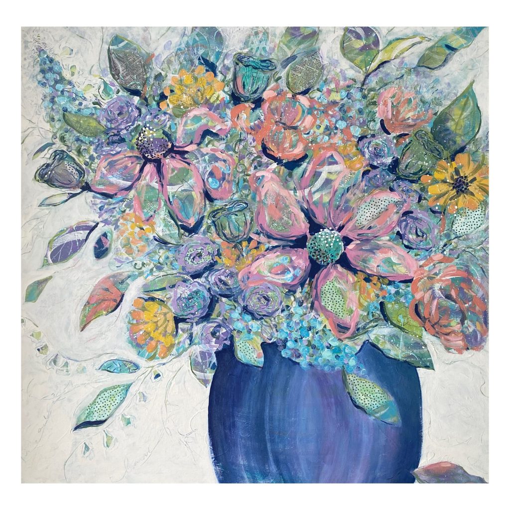 After studying Biology at Penn State, I translated my love of life sciences into a medical degree. Soon after becoming a doctor, I also became a mother first to 1, then 2, then 3 little boys! With them, I embarked on a grand adventure of growing and learning through children’s books, imaginary play, and travel together as a family. Throughout those full years I snatched bits of time for creativity in the form of photography and memory keeping, attempting to freeze time while my children were small to capture the stories of our family life together. When I next looked up, those children were incredible adults, scattered across the country, living their own grown-up lives. I retired and we moved our empty nest to State College where, almost 40 years ago, my husband and I had met in college. With uncertainty and excitement, I stood in front of a blank canvas of space and time in this new chapter of my life and wondered, how should I fill it? I listened to first the whispers, then the nudges, then the shouts of my soul to learn to paint and draw. Now I spend every morning that I am able, for as many hours as I can (& often more than I should!), in my lovely 2nd floor spare bedroom-turned-studio doing what I love, painting and drawing. My life is in full bloom! I have circled back to the flowers and trees I loved so much in the early years of my Biology degree and again, I study nature. I am learning to be an artist. With my eyes and hands and heart, I interpret my love of the natural world through paint and collage, pencil and pastel, texture and color, lots and lots of color! Welcome to the imperfect, joyful, exuberant garden of my heart!